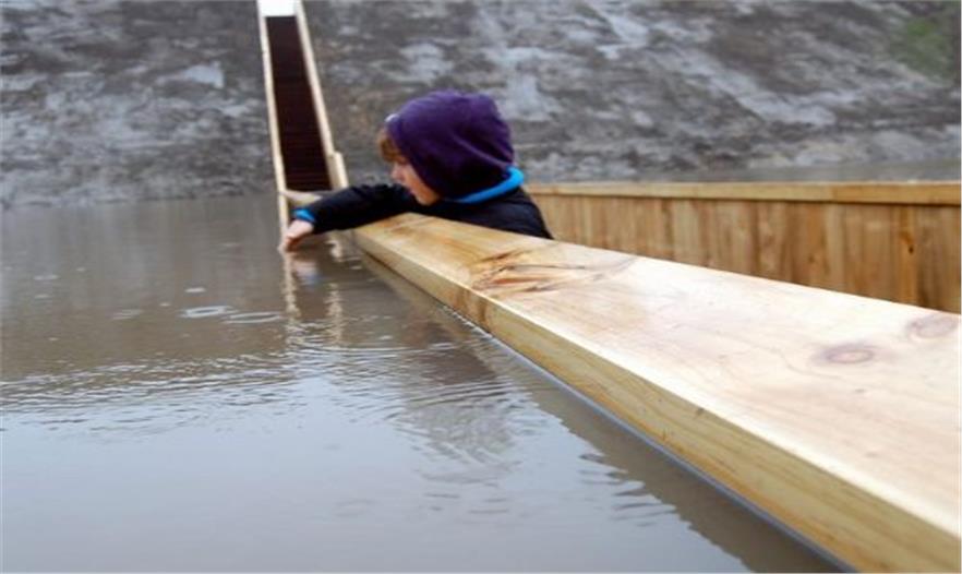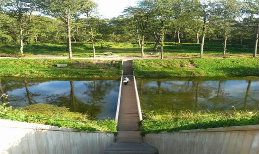 近期該地區(qū)開始向游客開放,該區(qū)最大的堡壘Fort de Roovere需要建造一座供人通行人橋梁。堡壘被護城河環(huán)繞,之前并未修筑任何橋梁。為了不破壞城堡原來的面貌,設計師選擇了這種下沉式的設計。RO&AD的建筑師提出的解決方案是建造一座嵌在水面上的橋——摩西橋(Moses Bridge),凹陷的橋略高于水面,遠處看去,橋的形象消失在人們眼中。人們從這座橋通過,就像是神話里行走在被劈開的水中,但實際上水流是連續(xù)的。(文字參考:yeskafei.com)