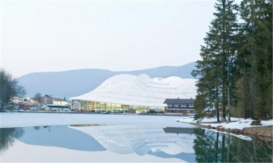 Inzell速滑館(Inzell Speed Skating Stadium)——Max Aicher Arena由斯圖加特建筑事務(wù)所Behnisch Architekten設(shè)計(jì),位于德國拜仁州巴伐利亞阿爾卑斯山北麓小鎮(zhèn)因采爾(Inzell)。該作品獲得了本年度世界建筑節(jié)的最佳體育建筑獎(jiǎng)。Max Aicher Arena是為了今年舉辦的世界速度滑冰單項(xiàng)錦標(biāo)賽而專門設(shè)計(jì)的。體育館的外形很像天上的云朵,波浪起伏的巨大白色屋頂覆蓋在原有場(chǎng)館之上,在白雪季節(jié)體育館又好似雪地上隆起的大雪丘。