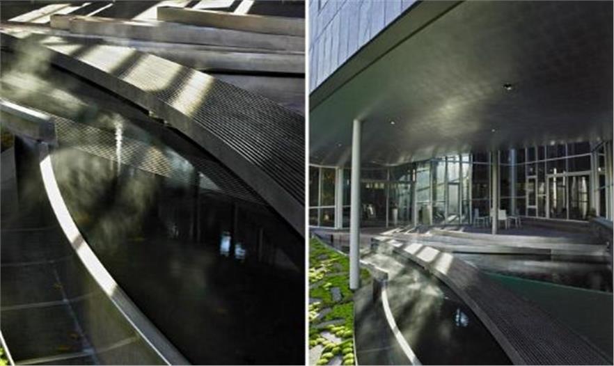 內(nèi)部庭院,池塘區(qū)域規(guī)劃了一個短途步行路徑?;◢弾r鋪地的縫隙之間長出百里香和苔蘚,并與森林的地面相連。銹蝕鋼板圍欄動感的繞在森林之中,建筑外面庭院里的池塘中間有使用到片層不銹鋼與玻璃材料。片層不銹鋼槽在池塘水循環(huán)系統(tǒng)中有著增氧以及過濾的作用。