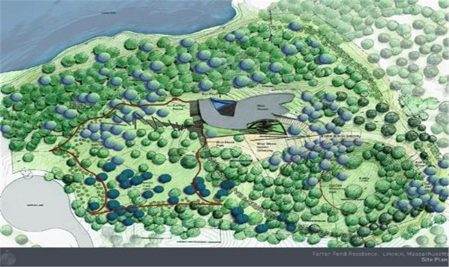 項目場地在一個三英畝的闊葉樹森林之中,俯瞰著瓦爾登湖區(qū)域眾多池塘中的一個。設(shè)計希望用現(xiàn)代的設(shè)計材料和元素來整合這篇土地上的植物,水域,地貌。一年四季,美麗的植物變換著不同的裝扮。雕塑圍欄交織在場地的不同地方,即界定邊界,又模糊邊界。此景觀設(shè)計體現(xiàn)了對客戶用地的深深敬意,同時其中使用的現(xiàn)代語言又反映了客戶在雕塑與藝術(shù)上的興趣。
