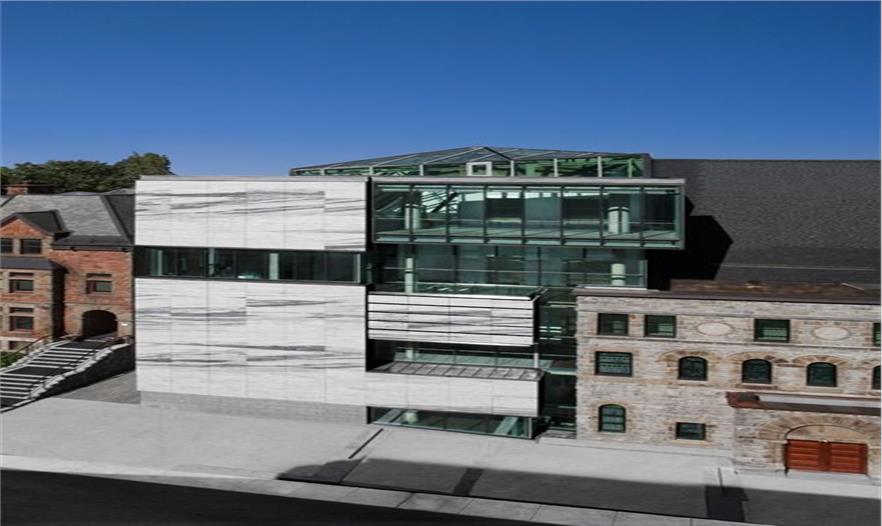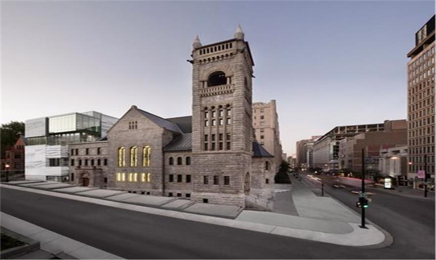 這座音樂(lè)廳是從一座維多利亞風(fēng)格的教堂改造過(guò)來(lái)的,其獨(dú)特的外墻被保留下來(lái)?;疑沂瘔γ婧偷窨痰淖厣玀iramichi砂石形成了一種非同一般的拜占庭風(fēng)格的穹頂。146扇刻花玻璃窗反射出周圍的景致,通過(guò)這些窗戶能夠看到城市的全景。音樂(lè)廳每年可舉辦100場(chǎng)左右的演出,有著良好的聲響效果。擴(kuò)建工程是由當(dāng)?shù)氐氖聞?wù)所Provencher Roy + Associés完成的,成功地將新舊兩個(gè)部分結(jié)合在一起。其中,新的展館采用了1500塊來(lái)自佛蒙特州的白色大理石,構(gòu)成了博物館現(xiàn)代部分的外觀。