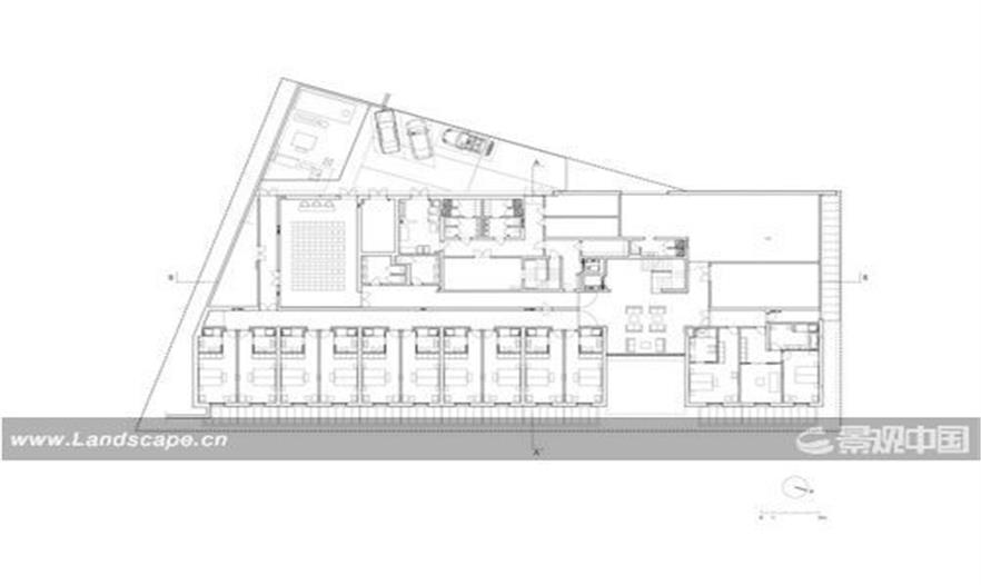地下室位于人行邊道的下面,低于花園的位置,包括技術(shù)區(qū)和服務(wù)區(qū),一個(gè)會(huì)議室,10間客房和一個(gè)溫泉浴室。地面層用一面巨大的玻璃虛化,里面是接待處,餐廳和露臺(tái)區(qū)。而白色的混凝土體則裝有與露臺(tái)相應(yīng)的其余客房和套房。