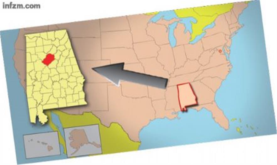 杰斐遜縣在阿拉巴馬州在美國的位置。 (馮飛/圖)