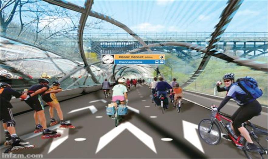 一種封閉式自行車高速路的想象圖,道內(nèi)可防止下雨等自然變化,未來還可能有氣流動(dòng)力助推。它可替代汽車高速路連接城市。