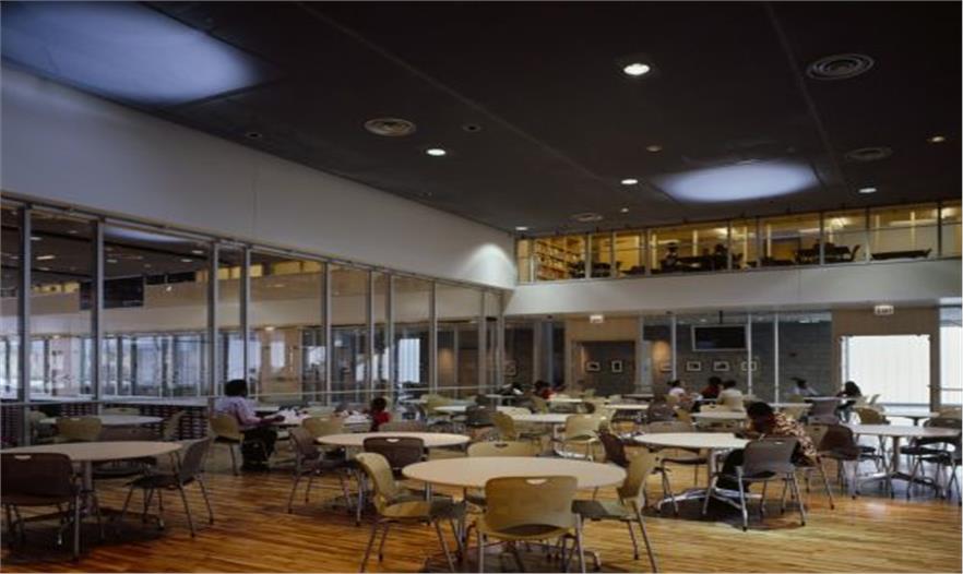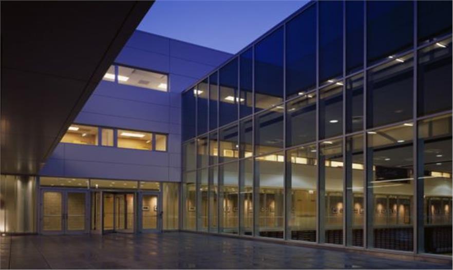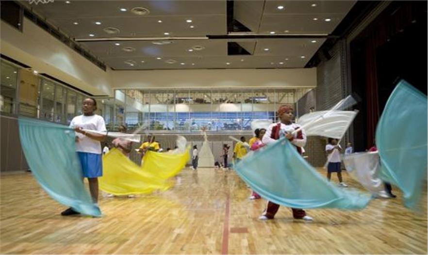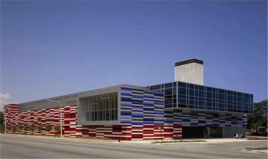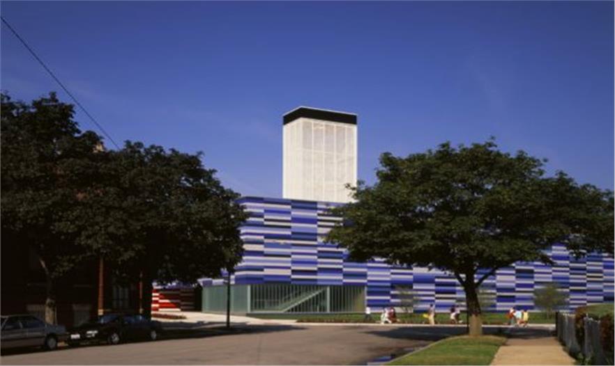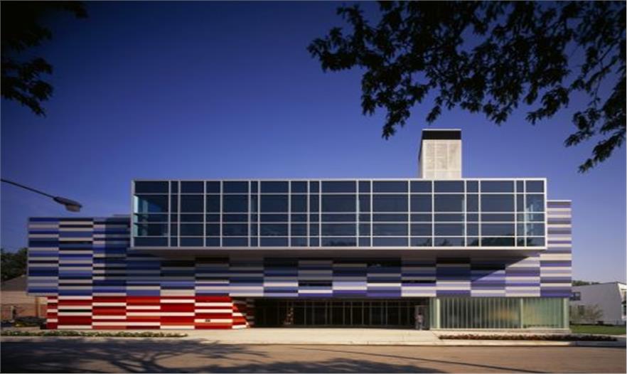 這座色彩鮮明的建筑位于芝加哥南部一個(gè)其貌不揚(yáng)的街區(qū)中,三層高的建筑體量總面積達(dá)75000平方英尺,可以滿(mǎn)足青少年娛樂(lè)和教學(xué)的需要。為了削弱沿街立面的封閉感,建筑師采用色彩鮮艷的纖維混凝土板作為幕墻構(gòu)件固定在鋼結(jié)構(gòu)外部。立面上的條形窗與無(wú)規(guī)則布置的彩色面板融為一體,而跟據(jù)室內(nèi)功能的需要,更大面積的開(kāi)窗則被安置在舞蹈廳和展覽廳的外部。一座兩層高的室內(nèi)體操房位于建筑長(zhǎng)方形平面的中部,其上部有伸出屋面的圓形天窗,可以為室內(nèi)帶來(lái)自然采光,同時(shí)伸縮式座椅和舞臺(tái)前電動(dòng)門(mén)的設(shè)置也可以使其輕而易舉地變成為一個(gè)可容納640人的劇場(chǎng)。