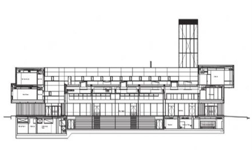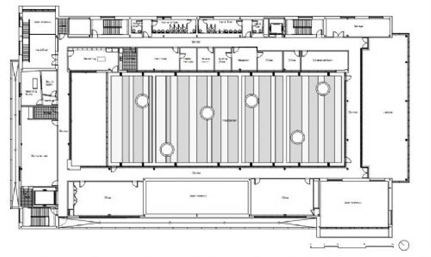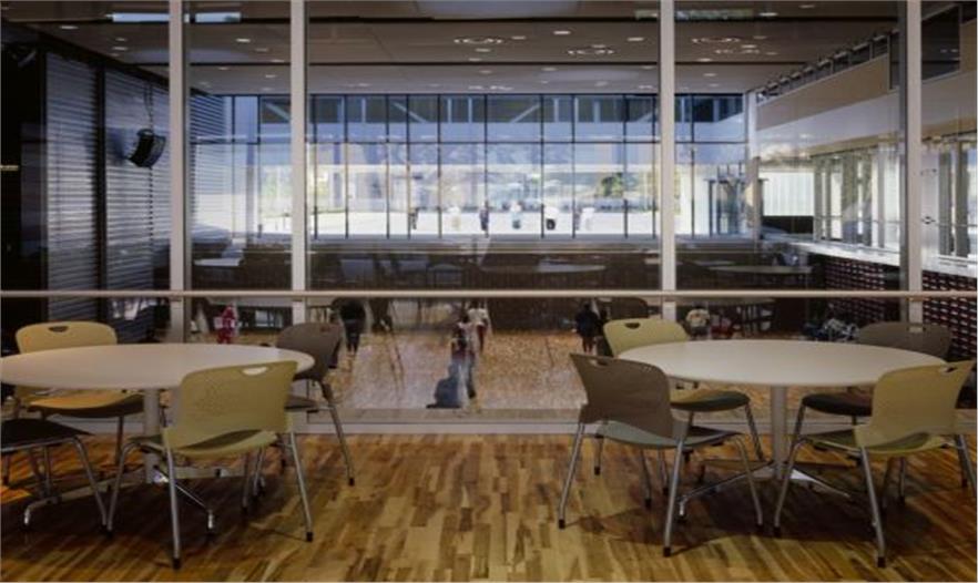 通過(guò)建筑體量的疊合,合理的功能流線(xiàn)和開(kāi)窗部位的巧妙設(shè)置,建筑師獲得了與建筑外觀相呼應(yīng)的空間多樣性,例如人們?cè)诳Х葟d中可以看到體操房中的活動(dòng),同時(shí)視線(xiàn)可以穿越入口庭院,看到室外停車(chē)場(chǎng)和訓(xùn)練場(chǎng),這樣的視覺(jué)通廊鼓勵(lì)了建筑內(nèi)不同使用者之間的交流和溝通。體操房和咖啡廳上部的植栽屋面可以對(duì)抗城市熱島效應(yīng),還可以進(jìn)行雨水回收,除此之外,屋面上的覆土厚度足以培育蔬菜和草藥,因而成為了一個(gè)天然的園藝課堂。