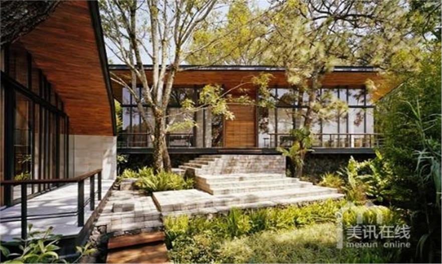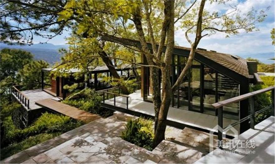 距墨西哥城90英里, Valle de Bravo的“林中之屋”(Casa en el Bosque)隱沒在茂密的當?shù)鼗▍才c古老而高大的松林中,占據(jù)有利地勢,可盡收群山、Avándaro湖以及塞羅戈多(Cerro Gordo)自然保護區(qū)的優(yōu)美畫卷。別墅由Parque Humano Architects設計,體現(xiàn)出建筑師與主人對周邊環(huán)境的深切尊重,建筑采用當?shù)氐目沙掷m(xù)性材料,并且完全依偎在森林在懷抱中。