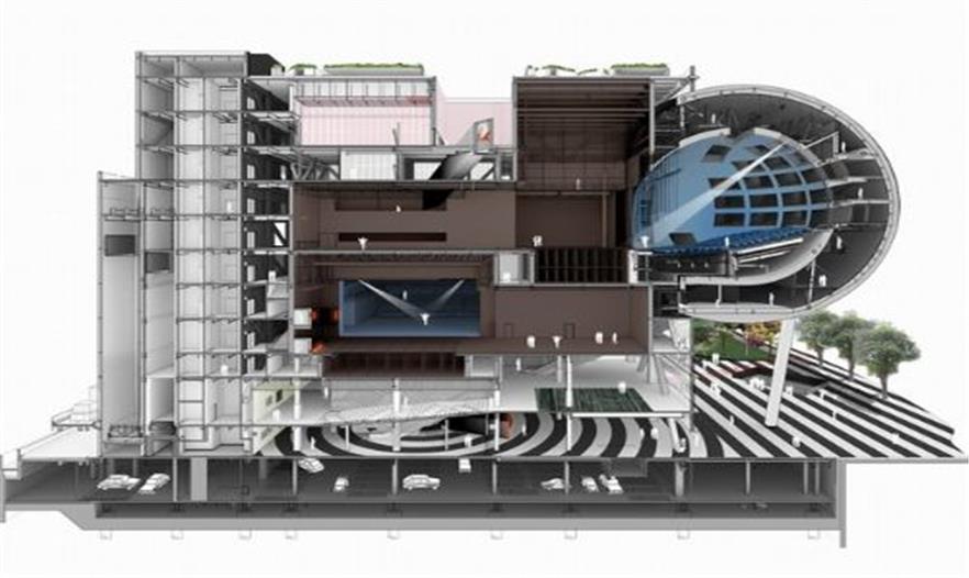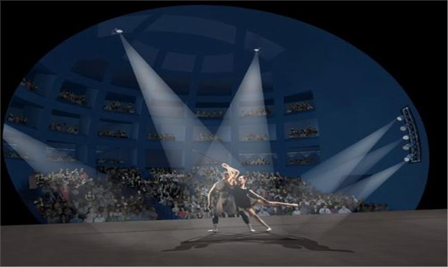 主劇場的形態(tài)類似一個懸浮的星球,嵌入到中心立方體中。觀眾可通過內(nèi)外殼之間的通道進入劇場。內(nèi)部球形框架和外部立方體的相交部分是形式獨特的表演舞臺,其特別的形狀能夠創(chuàng)造出任何富有想象力的場景。