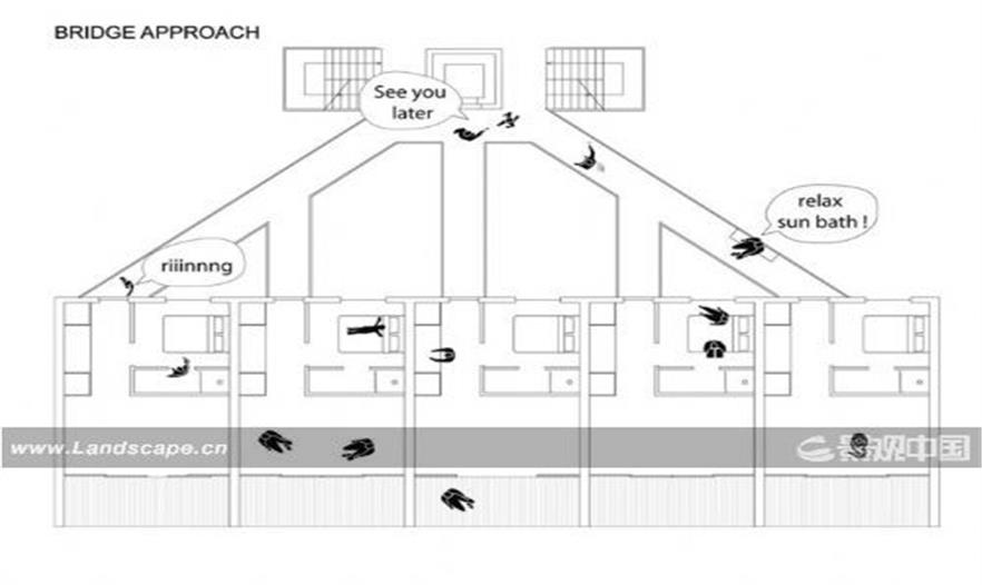 酒店的對(duì)稱建筑被復(fù)雜的3D迷宮狀結(jié)構(gòu)圍繞,由此進(jìn)入每一個(gè)房間。這種環(huán)形設(shè)計(jì)提高了每一套房的隱私度,尤其是和傳統(tǒng)的門廊式客房相比。迷宮/橋梁的模式為每一套客房營造了私密的橋上人行道。樓房之間,有一個(gè)室外院子作為大廳和公共空間,客人們可以在那兒見面。三亞5號(hào)地成為了一處豪華的休閑寓所,既重視戶外生活,又保證每一位房客的隱私。