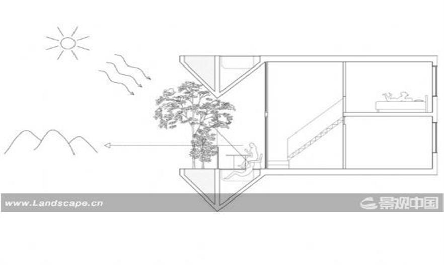 三亞5號(hào)地是一家更大的旅游開發(fā)公司的組成部分,該公司有4組對(duì)稱的建筑,一共8幢。樓房的外部是大型戶外生活區(qū),深陷的樹木草木種植槽。這個(gè)室外陽臺(tái)是室內(nèi)生活空間的延伸,可以減少空調(diào)面積。酒店的每一套房都有兩間臥室,一間小廚房,雙層高度的居住空間,可以接觸到盡可能多的自然光和景觀。陽臺(tái)的草木可以庇蔭,為房客提供涼爽的局部氣候。從酒店房間排出來的廢水用來澆灌植物。