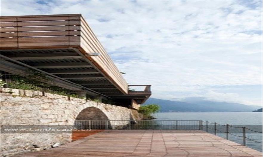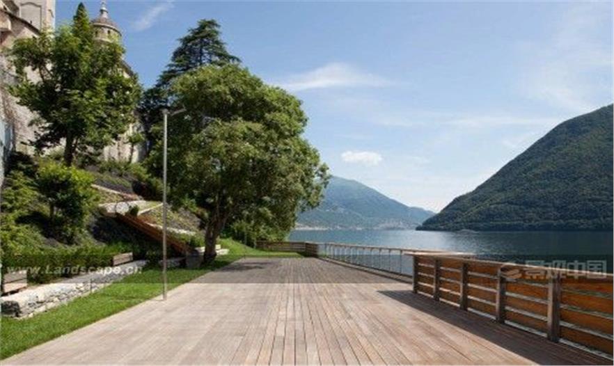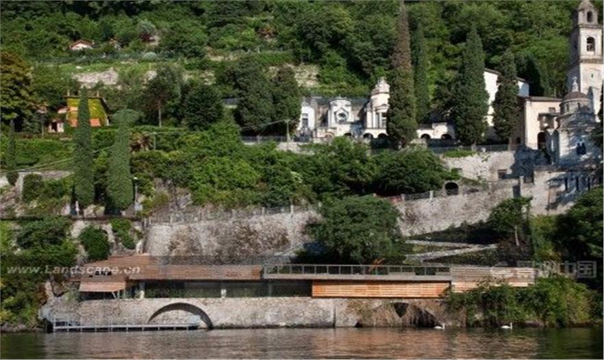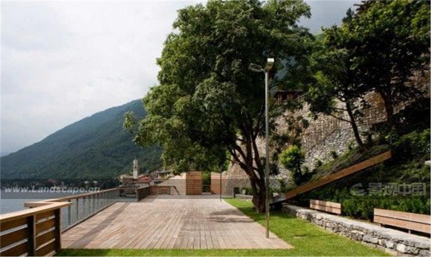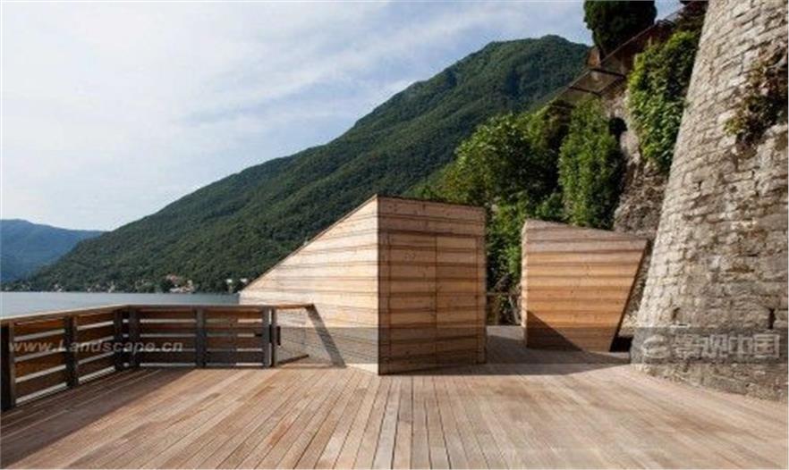 為了保證這一懸崖場(chǎng)地可以作為公共空間被使用,必須在湖上做新的構(gòu)筑,由擁有單獨(dú)地基和微型樁支撐的凹進(jìn)的柱子承擔(dān)重量。因此,該項(xiàng)目有幾個(gè)要素:石階,木甲板和落地支持平臺(tái)。廣場(chǎng)地平面微微向北傾斜,在感官上擴(kuò)大了空間,并把它轉(zhuǎn)化成一個(gè)小平臺(tái),構(gòu)成觀賞歷史文化中心和對(duì)岸的新視角。