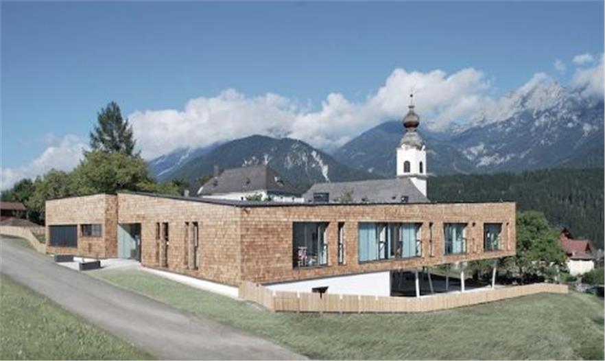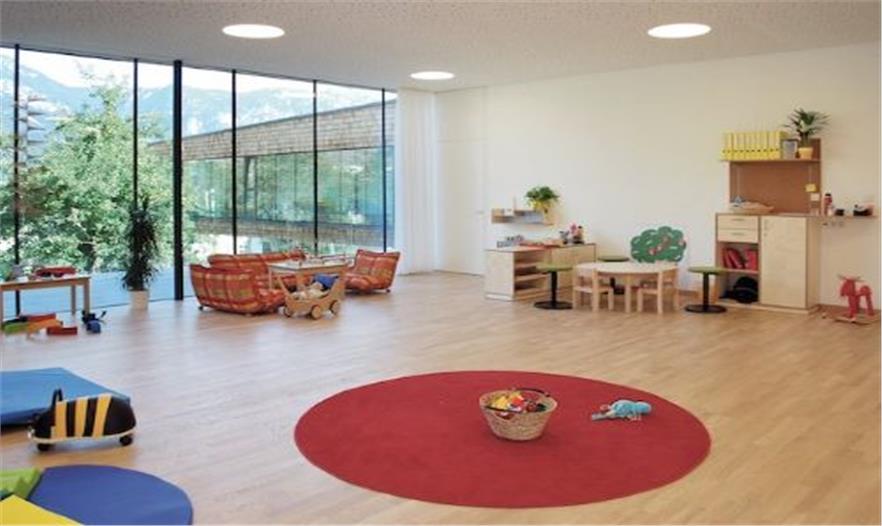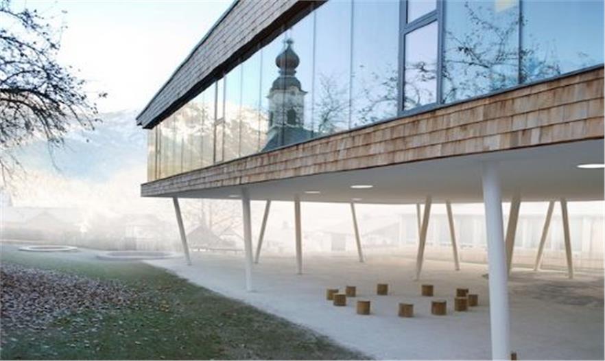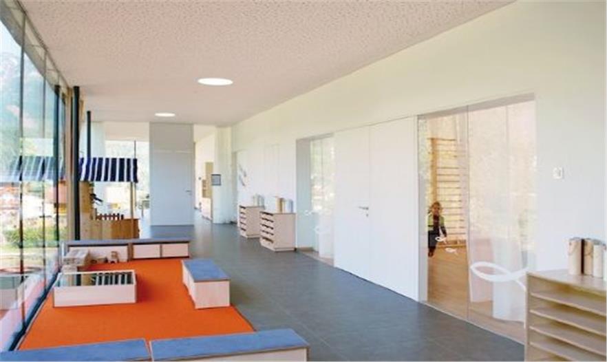 新建的幼兒園作為牧區(qū)住宅與L形地塊的補充,旨在為孩子們營造一個特別的有吸引力的開放空間。建筑首層局部架空,為孩子們贏得了更多的戶外活動場地。