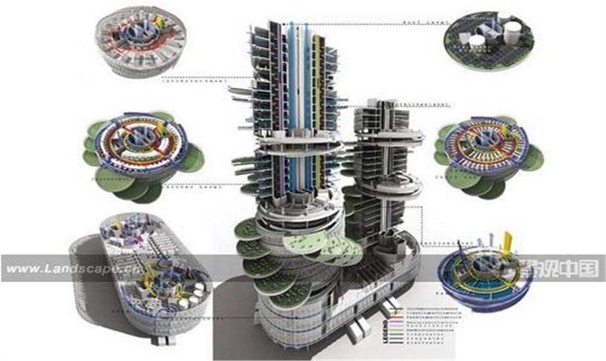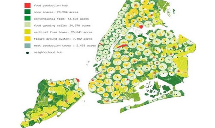 城市將被劃分為多個中心,著重用于食物產(chǎn)出、開放空間、食物生長細胞、垂直農(nóng)場、肉類生產(chǎn)塔、街區(qū)樞紐等問題。方案利用了眾多建筑未使用的屋頂,30層高的新建筑農(nóng)場,可食物墻體和街道農(nóng)場等。主要的框架思路是在不破壞現(xiàn)有城市流通的基礎(chǔ)上,將可食用的綠色融入到混凝土景觀中。