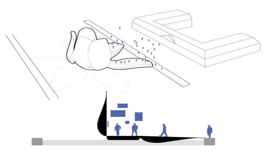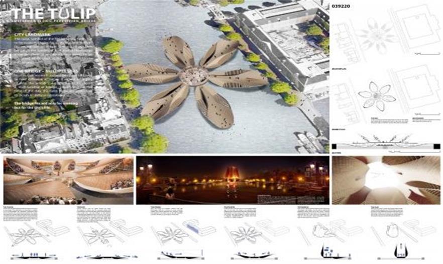 由Michael Labory 和Bertrand Schippan針對阿姆斯特丹人行天橋而設(shè)計的城市地標(biāo)方案不僅是為了修建十字路口,更是為了城市生活的便利。郁金香是荷蘭的象征,因此成為了阿姆斯特丹城市標(biāo)志的明智選擇。易于辨認(rèn)的外觀使它成為地標(biāo)性建筑,當(dāng)居民們舉辦活動時,阿姆隱士美術(shù)館(Hermitage博物館)的位置也就顯得獨特而不被混淆了。下面附上更多的設(shè)計圖與建筑師的解說。