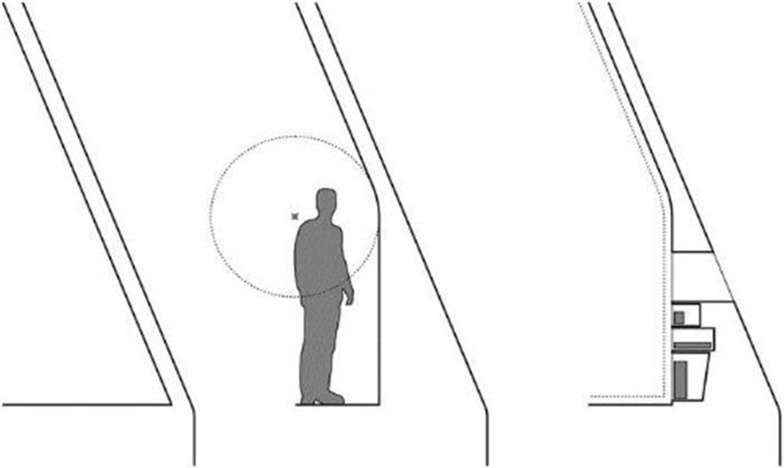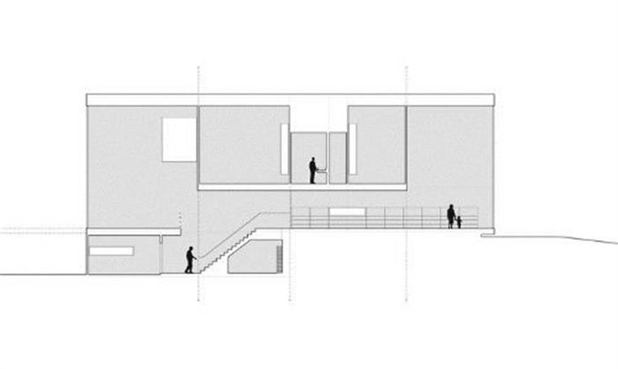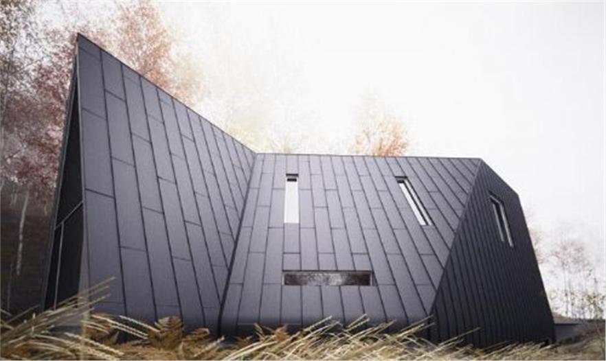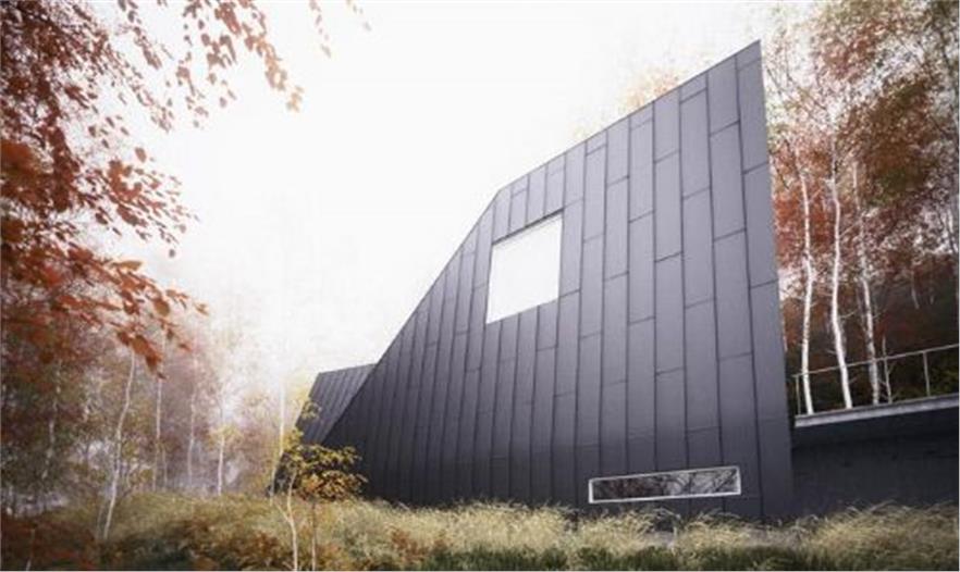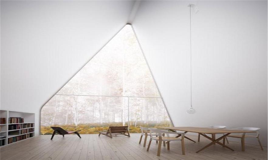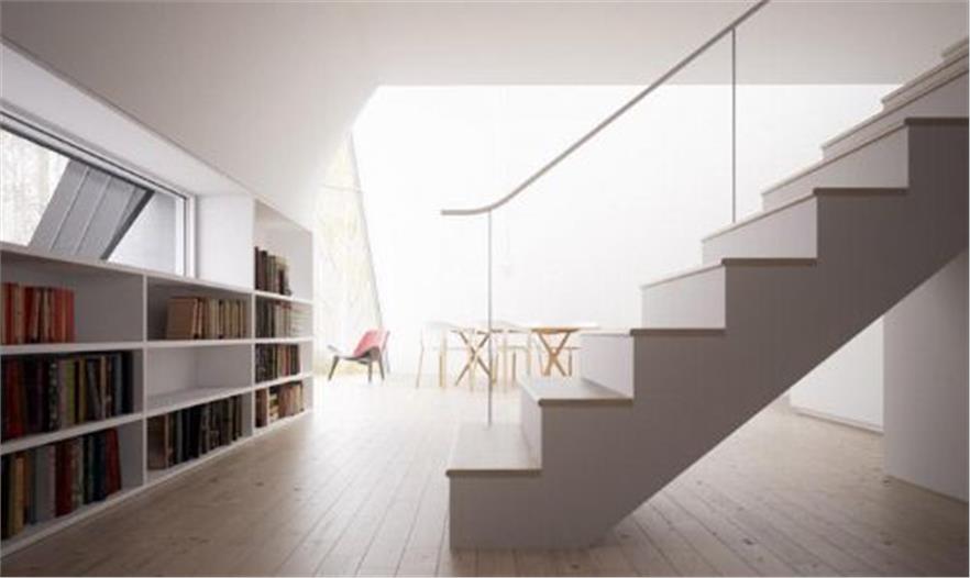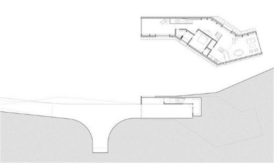 建筑由三段傾斜體組成。西側(cè)一段是圖書館,車庫(kù)還有酒窖;中段是兩個(gè)臥室和浴室;東側(cè)是客 廳,廚房還有餐廳。體量上縱向高度被夸張的拉大,地板與墻面夾角區(qū)域部分用于儲(chǔ)藏。