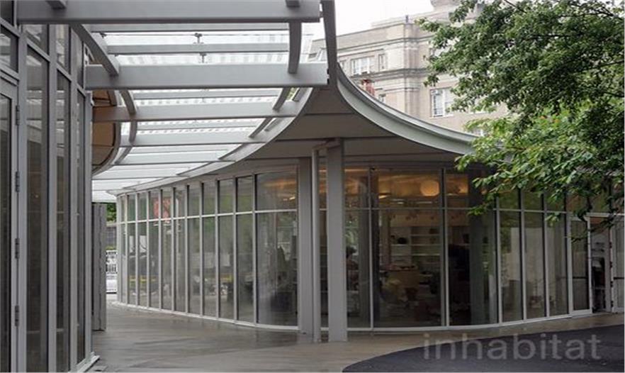 游客通過一個成90度角開放的華麗的白色鐵藝圍欄進入這一建筑,圍欄連著下沉雨水花園,雨水花園將匯集暴雨徑流,并在夏季長滿植物。沿緩坡向上將到達由曲面屋頂相連的兩個坡狀結構的交點。左邊是植物園的新禮品商店,右邊則是主要的迎賓中心。