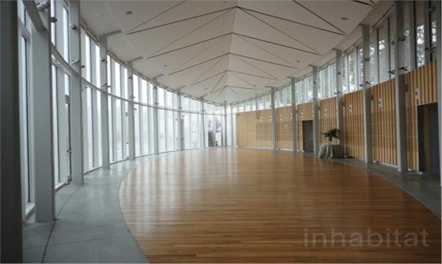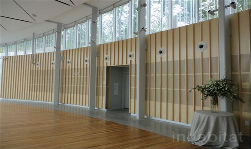 建筑的內(nèi)部充斥著有機形狀和線條。迎賓中心大廳設有交互式園內(nèi)動植物視頻和可持續(xù)建筑的標志。室內(nèi)的亮點是一個巨大的樹葉狀活動空間,由兩個延伸至兩倍室內(nèi)高度的拱形墻組成。玻璃墻經(jīng)過蝕刻以防止鳥類的誤撞,同時呈現(xiàn)與戶外樹木的共生形態(tài)。構成室內(nèi)木制面板的木條由場地上的磨碎的銀杏木制成?;顒涌臻g的外部是一個天井,供游客休息靜坐和沉思。