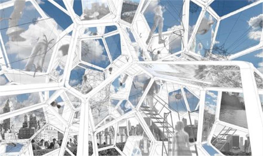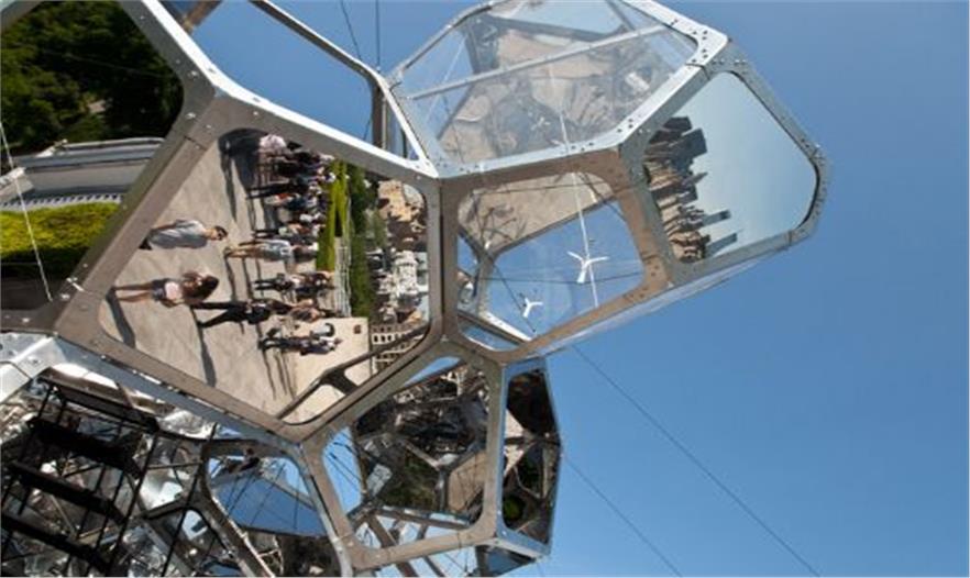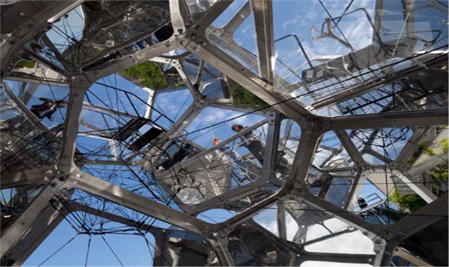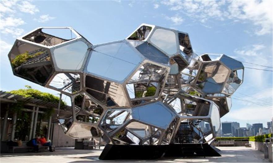 構(gòu)單元和玻璃組成,這些單元相異,組合在一起讓裝置富有生命力。裝置反射著城市,公園,