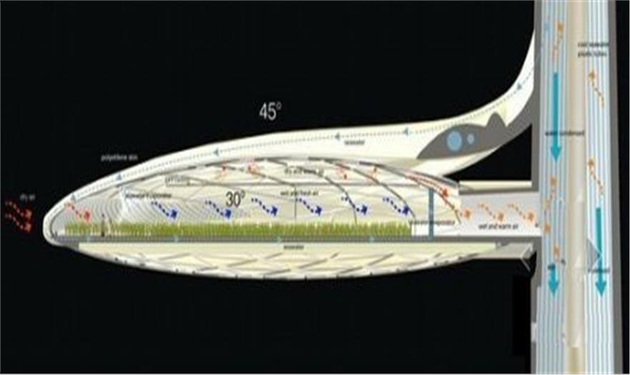 StudioMobile事務(wù)所在迪拜設(shè)計的海水垂直農(nóng)場通過利用海水降溫,保持溫室濕度,將充足的濕度轉(zhuǎn)換為新鮮凈水,用來澆灌作物。由于迪拜交通情況混亂,土壤珍貴,缺乏淡水等情況,這樣的垂直農(nóng)場有利于充分利用城市空間。