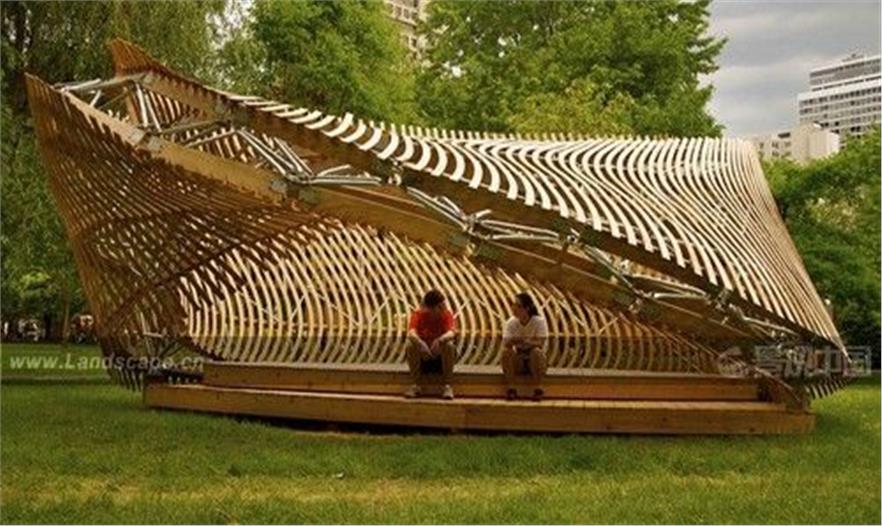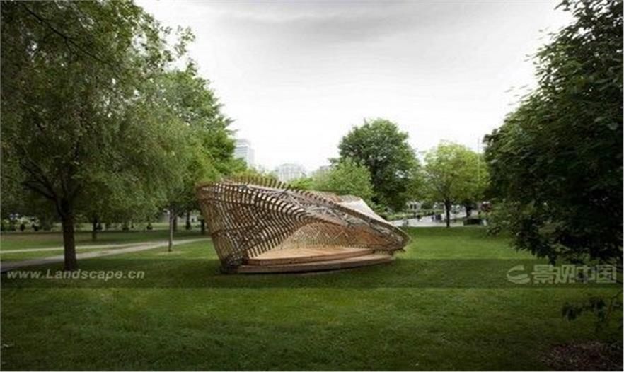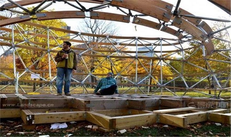 ContemPLAY亭子由McGill建筑學(xué)院的指導(dǎo)研究工作室(Directed Research Studio, DRS)與媒體與調(diào)停建筑研究機(jī)構(gòu)(Facility for Architectural Research in Media and Mediation, FARMM)共同完成,是一個(gè)學(xué)生主導(dǎo)的項(xiàng)目。它為學(xué)生提供了在學(xué)術(shù)背景下通過(guò)實(shí)踐經(jīng)驗(yàn)進(jìn)行學(xué)習(xí)的難得機(jī)會(huì)。亭子占地8.8米x 6.7米,全高3.7米,位于魁北克省蒙特利爾市McGill大學(xué)的麥克唐納-哈靈頓大樓前。