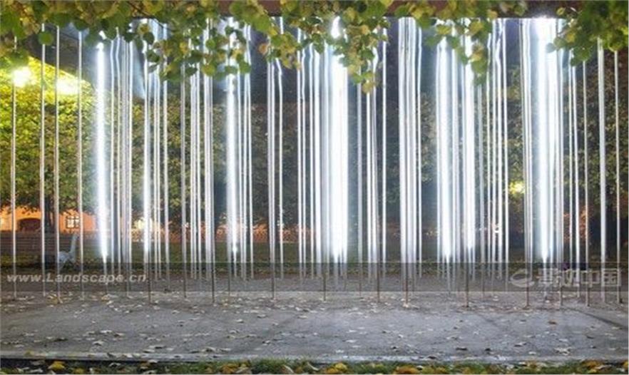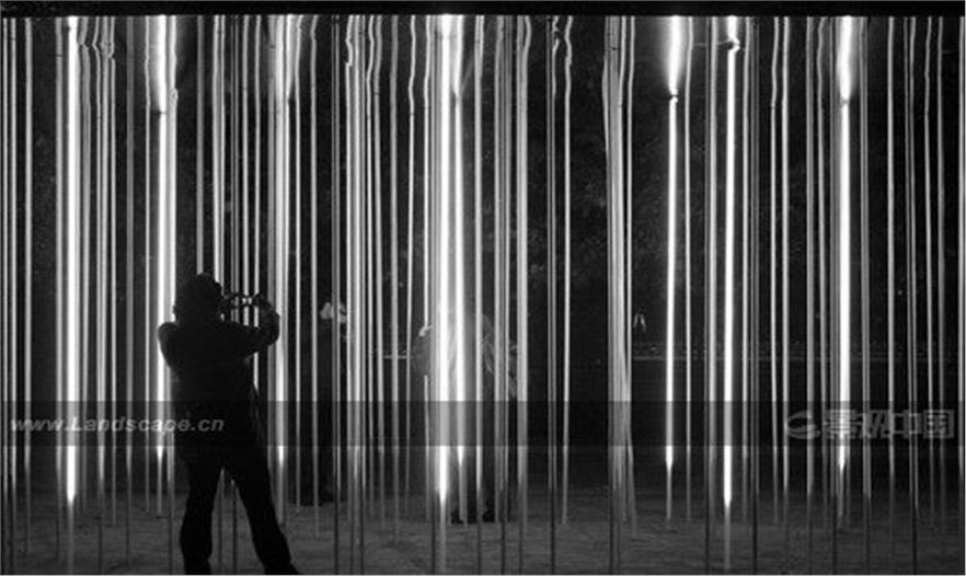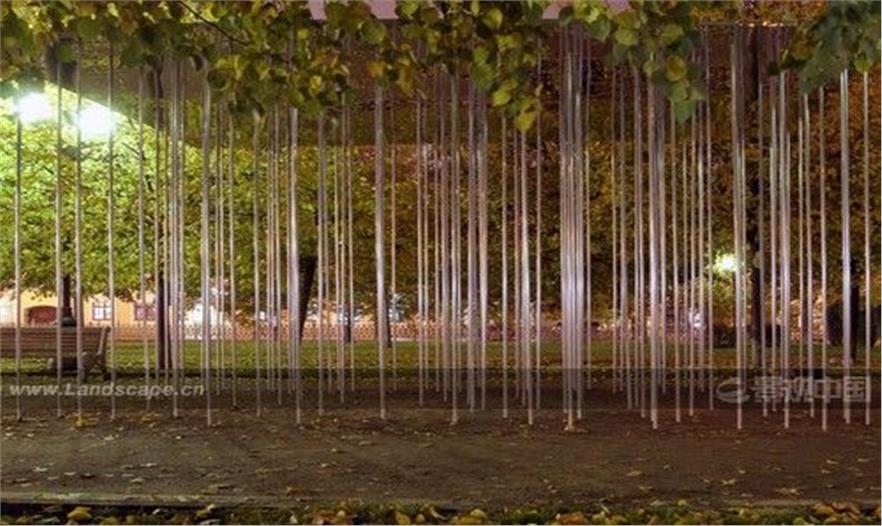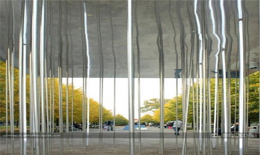 有一條略微彎曲的寬敞小路穿亭而過;因此不會破壞亭子的外立面效果。其中有10%的管子能夠發(fā)光,這些管子是由聚氨酯制成的,其內(nèi)部設(shè)置了LED光帶。由于屋頂?shù)溺R面和磨光的管子所產(chǎn)生的效果,夜晚亭子內(nèi)部充滿了亮光,整個亭子成為了一個大燈籠。