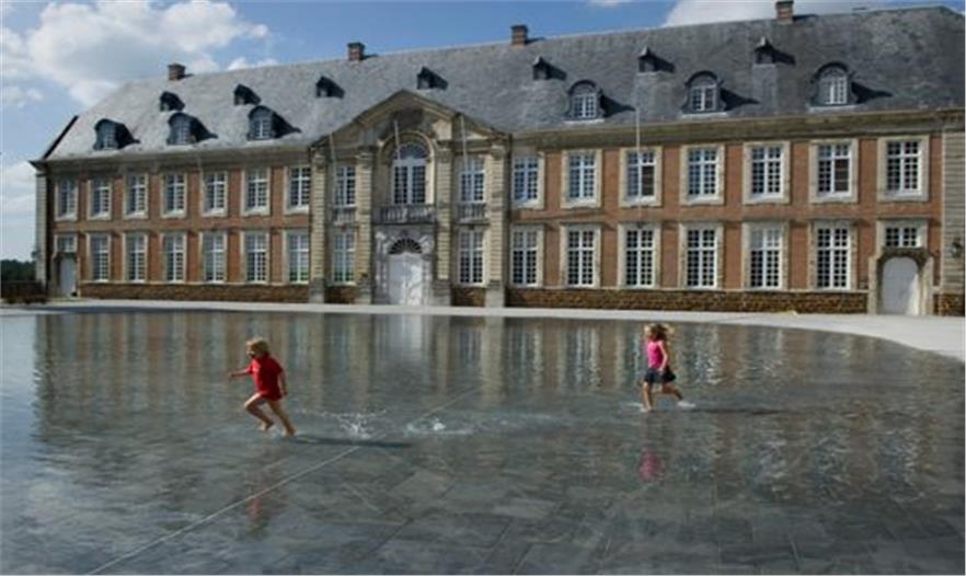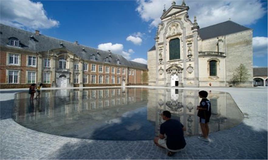 設計師在這個巴洛克教堂和歷史建筑群的前院設計了一個非常淺的水池,為邊緣的建筑物創(chuàng)造了一個巨大的反射鏡面。這個只有幾厘米深的淺水池讓過路的人們在周邊休憩,或是在炎熱的夏日從水面上直接穿。