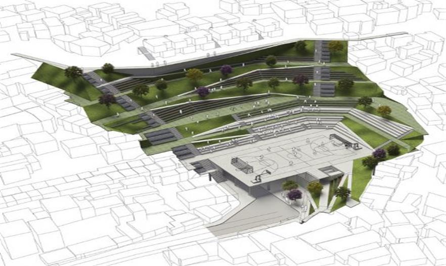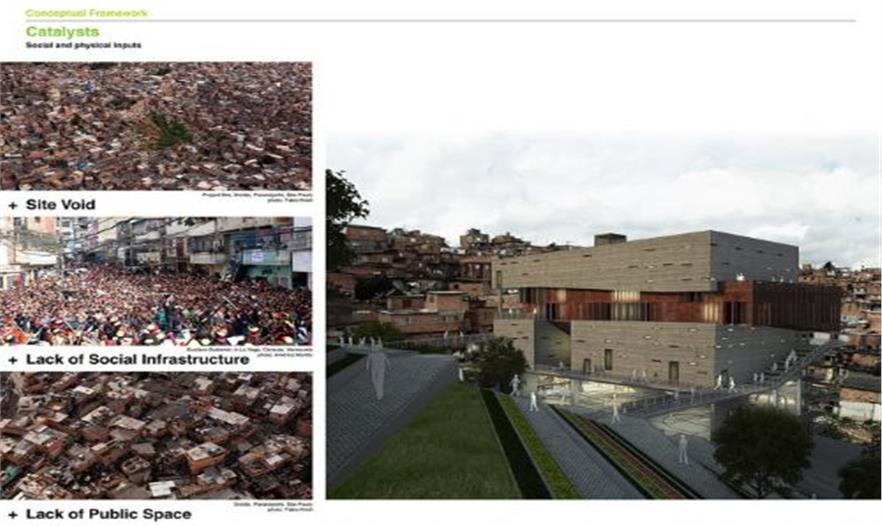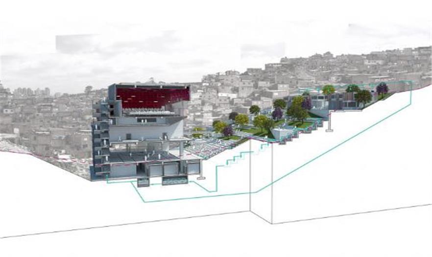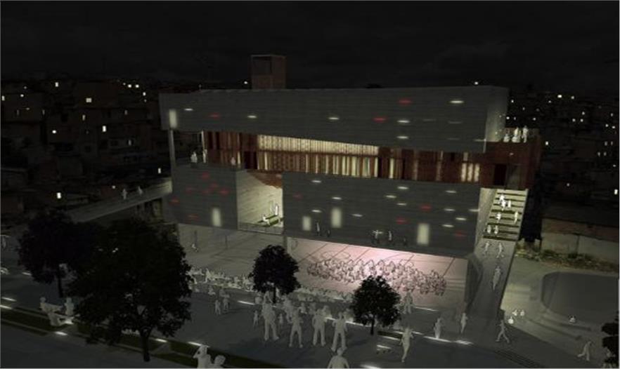 場地較低地區(qū)有原有音樂學校的雛形,垂直層面堆疊了幾個不同的項目,以最大限度地提高場地的潛力。這些措施包括巴士站/運輸基礎設施、足球場、社區(qū)中心、和音樂學校、其中包含教室、練習室、錄音棚和演出大廳。這些新設施,從本質(zhì)上而言是一家音樂教育基地,是這一地區(qū)重要的催化劑,不僅將音樂活動滲透到貧困的棚戶區(qū)內(nèi),而且形成了一個新的網(wǎng)絡,將服務滲透到社會的各層青年中。同時還在第一層引入了金融性空間,以經(jīng)濟型車輛的形式活躍街道層面。