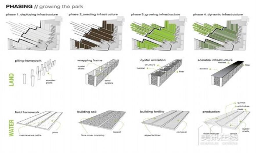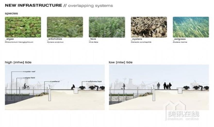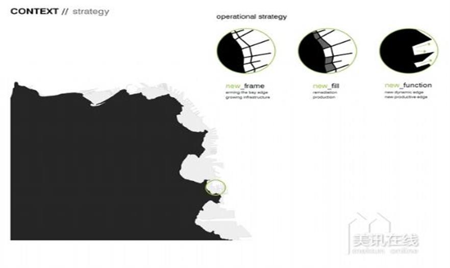 歷史上,舊金山灣是一片變幻不定的區(qū)域,經(jīng)常受大風(fēng)、侵蝕和洪水影響。在過(guò)去的幾個(gè)世紀(jì)里,海灣邊緣情況相對(duì)穩(wěn)定了。工業(yè)化的邊緣區(qū)域的形成是通過(guò)對(duì)長(zhǎng)年累積的復(fù)雜淤積和沖積結(jié)構(gòu)的調(diào)度部署形成的。如今,邊緣地區(qū)在經(jīng)濟(jì)、生態(tài)或社會(huì)等方面的影響力已不再重要,該項(xiàng)目提出了一種利用海灣邊緣地區(qū)的新方法,創(chuàng)造出了具有生產(chǎn)力的景觀,為全社會(huì)提供新的綜合性用途和機(jī)會(huì)。