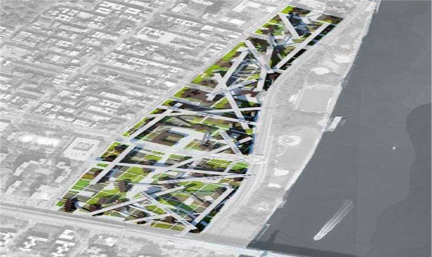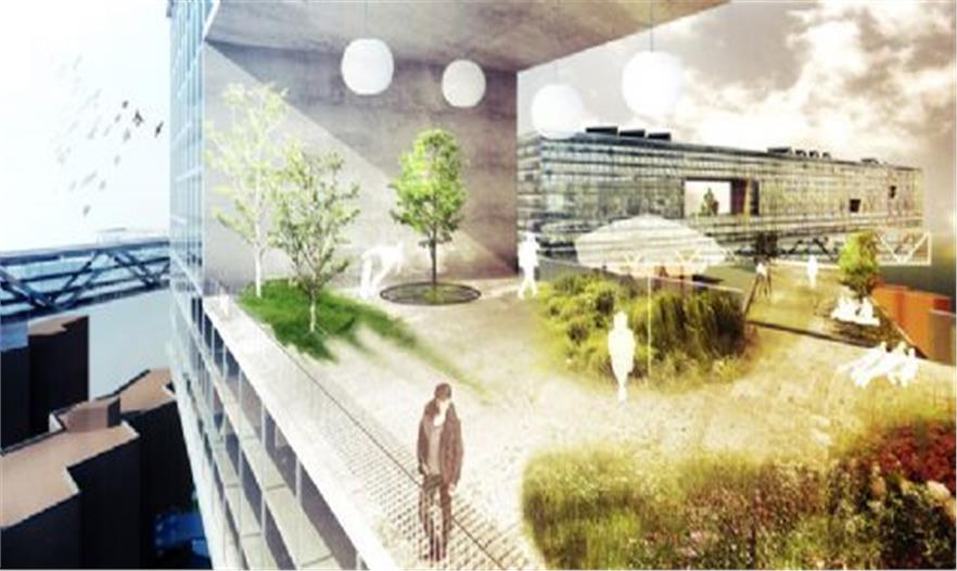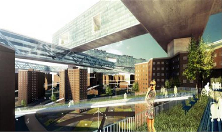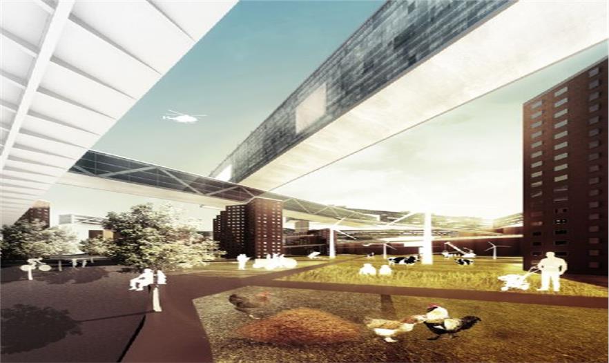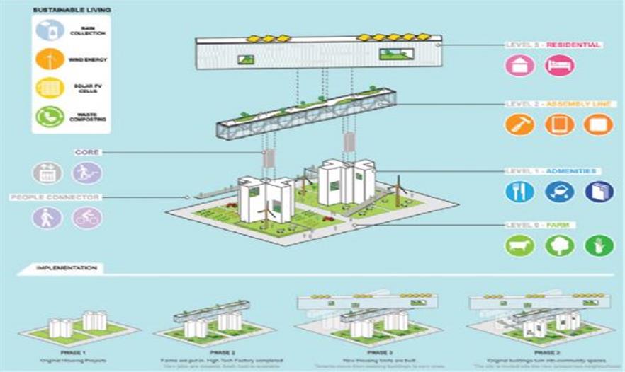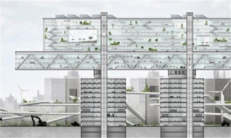 建筑師設計了一種社區(qū)系統(tǒng)希望能成為刺激互動的催化劑,包括公共農(nóng)田和遍布corbusian住宅區(qū)地下空間中的各種便利設施。公共農(nóng)田會為居民提供新鮮的蔬菜作物,以改善他們不健康的日常飲食。此外,這個方案還設計了一系列橫跨在各個塔樓之間的橋梁建筑,內(nèi)部有職業(yè)學校,高技術生產(chǎn)設備和更多居住單元。