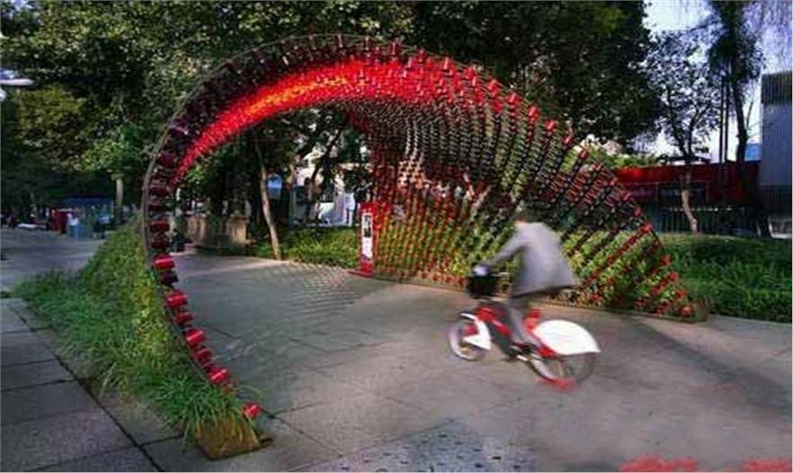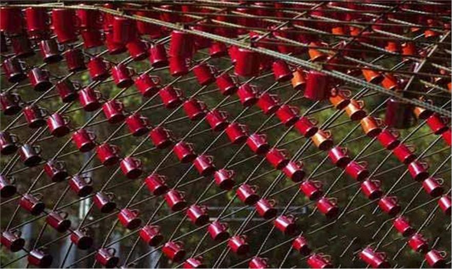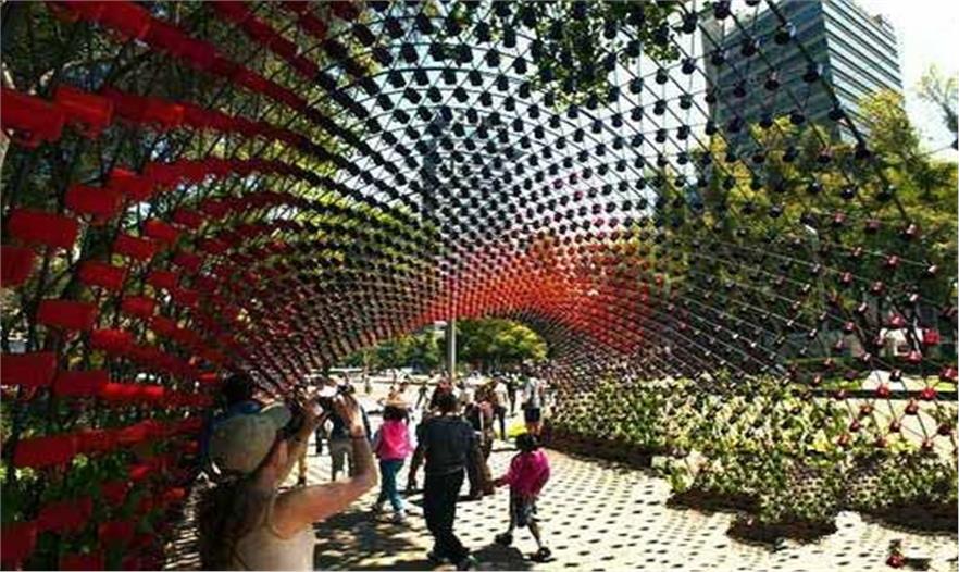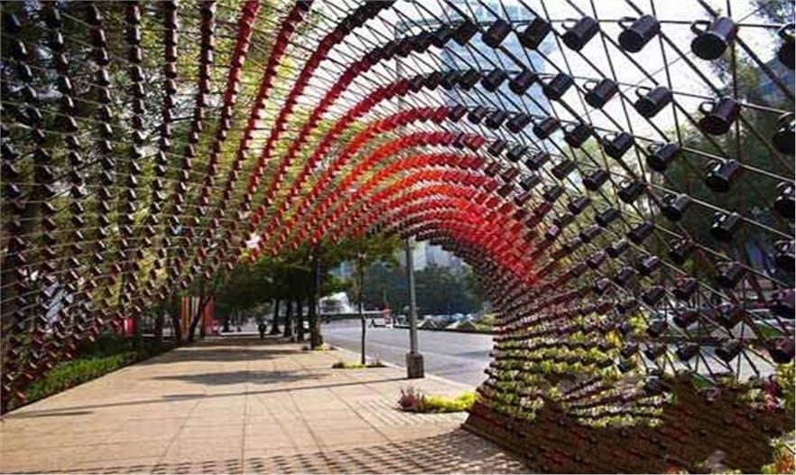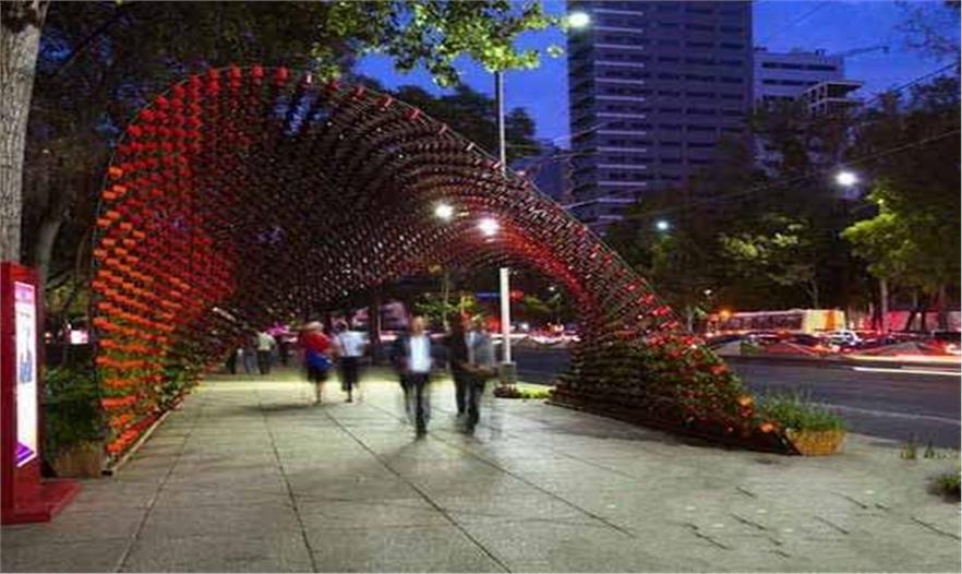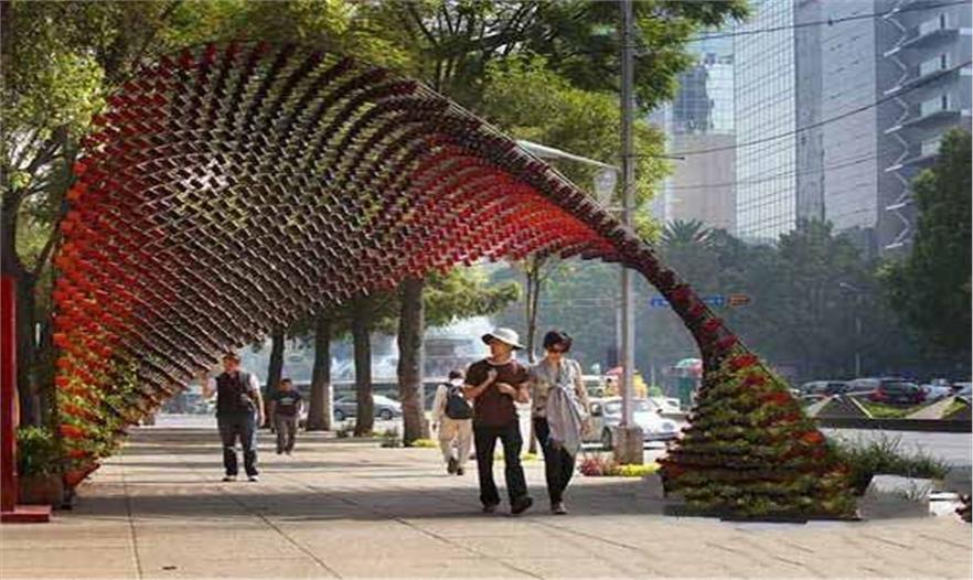 咖啡巨頭雀巢公司指派Rojkind設(shè)計公司,運用1497枚金屬咖啡杯制作了一個活潑的城市藝術(shù)裝置。多彩馬克杯被固定在位于墨西哥城的一系列弧形鋼筋上,在入口處內(nèi)側(cè)營造出炫目的光影,裝置外側(cè)最終被覆蓋上濃密的綠色攀緣植物。
