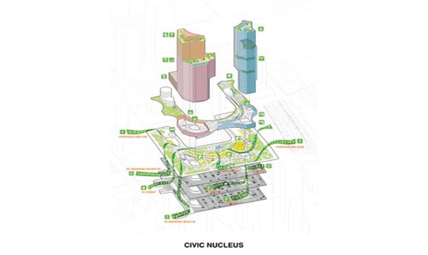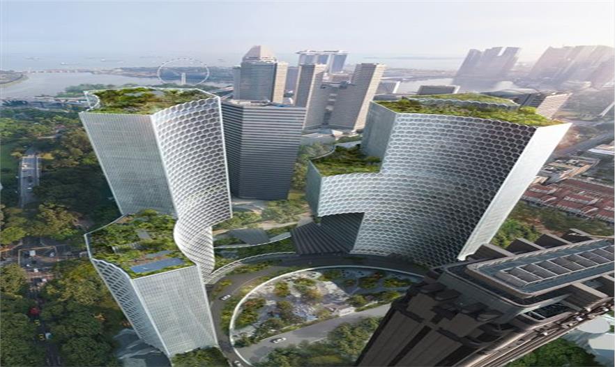 基地上設(shè)計了一個多孔可滲透的熱帶景觀,消解了大樓直落地面的突兀感。休閑區(qū)域和花園作為多個交通樞紐的連接點,建立起一個流動的熱帶花園和商業(yè)環(huán)境,供公眾二十四小時使用。一個廣場被鑲嵌在大樓中間,巧妙地利用周邊建筑作為它的邊界,形成一個新的公共區(qū)域,連接Kampong Glam的歷史區(qū)域和城市商業(yè)延伸地塊。
