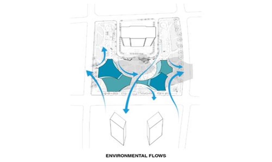 項目同時融合被動節(jié)能和積極節(jié)能設(shè)計實現(xiàn)其環(huán)保功能,通過自然通風(fēng)來造就熱帶生活的舒適性,最小化能耗并融入自然環(huán)境。建筑的朝向已經(jīng)通過日照角度和風(fēng)向的優(yōu)化,凹進形的建筑體量可使得風(fēng)在基地內(nèi)自然流動,在遮陽室外空間形成涼爽的小氣候。
