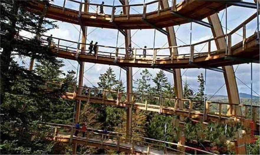 如果你想以蜜蜂和鳥類的視角鳥瞰我們的世界,可以選擇來到德國最近開放的世界最大的樹頂走道。項目圍繞三株周長38米的巨大杉樹,木質坡道總長超過500米,高度達44米。項目坐落于風光綽約的巴伐利亞國家森林公園中,樹頂走道同樣面向乘坐輪椅的殘障人士,家庭中每個成員都能欣然前往。