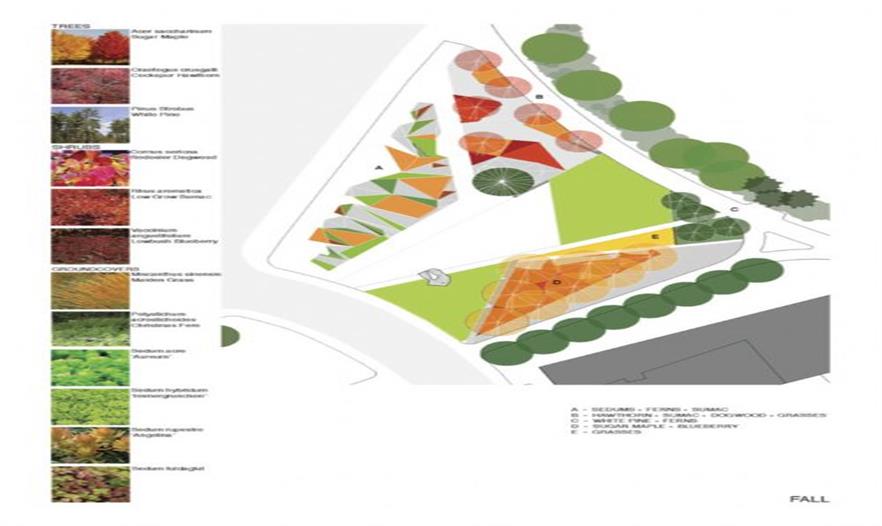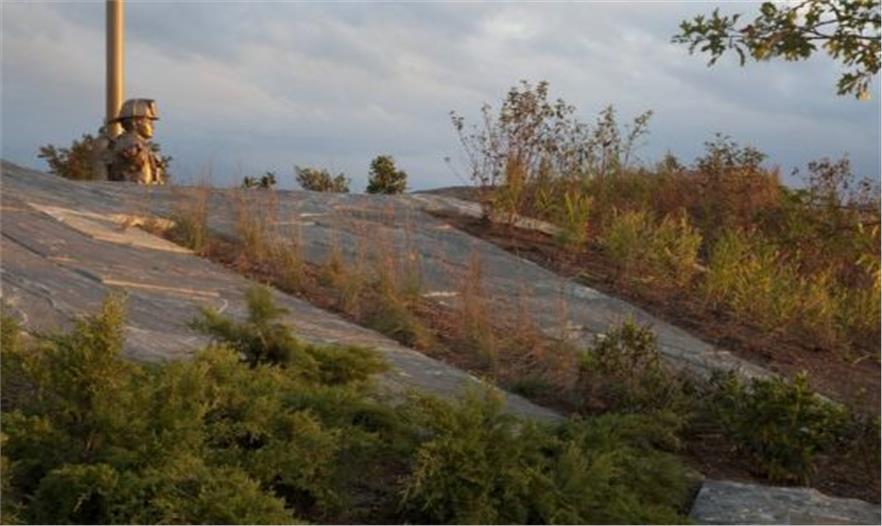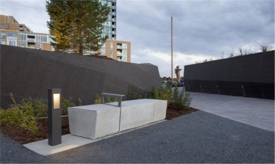 設(shè)計既要實現(xiàn)游行與集會的場所和引導(dǎo)訪客來到此處,又要介紹一系列的建筑、雕塑和園林。沿著刻有消防員名字的景觀墻可以到達中間的儀式集會區(qū)域。項目的標(biāo)志性景觀節(jié)點:1/2真人大小的消防員形象的青銅雕塑(它代表了國家消防員的傳統(tǒng)形象)、60英尺高的消防滑竿,1棵松樹和花崗巖名字墻(抽象的描述了加拿大的地圖,墻上刻有消防員們的名字)。