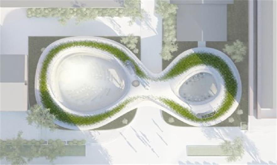 建筑的設計概念來自于無限符號,建筑師將功能分為兩大塊,聚會場所和禮拜場所。最終設計出的流動的建筑形態(tài)是由不同環(huán)境和功能相互推擠形成的?;⌒螇γ鏋楣饩€反射提供了良好條件,同時還設計了一個可上人的綠色屋頂。外圍交通區(qū)域被一道透明玻璃墻包圍,讓人們能在這個公共區(qū)域相會交流,同時它也是戶外庭院的一部分,讓建筑與環(huán)境完美融合。