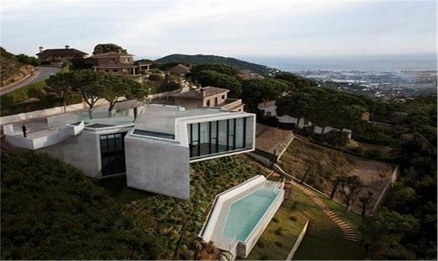 房子巧妙地嵌入身后的山體,既避免了不必要的深度挖掘工程又增添了建筑特色,猶如一只懸臂懸于空中,使得人們站在后方的上街道也能對它一覽無余,同時房頂上也建有一個眺望點,供房主欣賞美景。這項工程一共有兩層,頂層包括一個車庫,一個工作室,一個盥洗室和一個主臥,是主人的私人區(qū)域。底層用于公共用途,一共隔成上下兩層,廚房與起居室重疊交錯,圍繞著一張至于中心的8米長的桌子。建筑的突出部分也設(shè)計了一個明顯的分界,以保證從里面能看到各個方向的美景;同時,嵌入的另半部分建有服務(wù)區(qū)和一些房間,一個游泳池,它坐落在幾個矮矮的小山丘之間,在樹林掩映之間,一片綠色盎然。