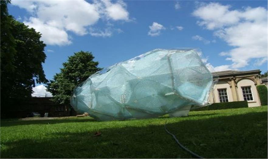 這一系列作品的第一版本漂浮在越后妻有藝術(shù)交流中心的水池上,這次創(chuàng)作的第二個(gè)版本是應(yīng)beam gallery的委托為orangery的綠洲專門設(shè)計(jì)的。雖然只有第一版“aqua-scape”的一半大,但它在綠色的環(huán)境空間中保持自己的特色,并延續(xù)了這一系列作品的概念,發(fā)現(xiàn)塑料形態(tài)與自然的關(guān)系。