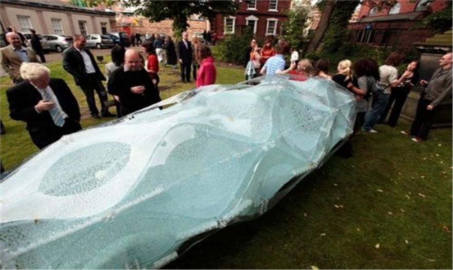 裝置采用了最新型的建筑材料,特別是塑料,創(chuàng)造出柔軟的建筑形態(tài)。設(shè)計(jì)師套用藝術(shù)折紙概念,用一片脆弱的透明聚碳酸酯材料直接折疊出裝置的形態(tài)。設(shè)計(jì)師再一次用正弦波的編織方法創(chuàng)造出彎曲的空間脊柱。裝置本身是“沒有骨骼”的,但仍舊有蝦一樣的結(jié)構(gòu)外殼,這層透明的殼包裹了由聚乙烯纖維構(gòu)成的柔軟核心。這層內(nèi)殼讓裝置與場(chǎng)地發(fā)生了有機(jī)共鳴。