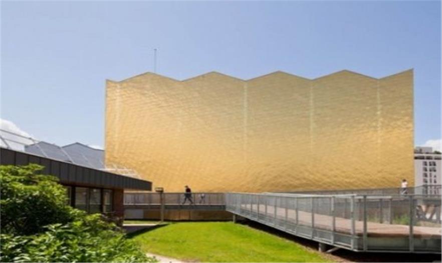 主體體量?jī)?nèi)含一個(gè)可靈活調(diào)整的400座禮堂,外面則披上金色鱗片,像耀眼的黃金甲讓周圍建筑黯然失色。一個(gè)與眾不同的大膽對(duì)立形象。從維護(hù),使用壽命,環(huán)境,能源等方面綜合考慮,外觀材料最后選擇了銅。這個(gè)富有表現(xiàn)力的建筑是城市中心的強(qiáng)大存在,其中俏皮的空間就像一個(gè)大放異彩的魔盒,容納文化和休閑還有設(shè)計(jì)之美,吸引了所有目光。金光閃閃的皮膚也照亮了大廳。