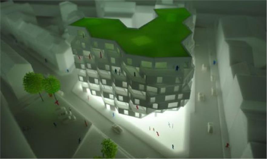 建筑綜合體呈現(xiàn)出三棱形結(jié)構(gòu),中間嵌入了露天庭院。交疊的玻璃里面朝向最佳采光和視野角度。雙向維護墻面為每套公寓創(chuàng)造出梯田景觀以及獨立于隔壁區(qū)域的私密感。宜居樓層分布在巨大的中央綠色空間四周,總體結(jié)構(gòu)還包含一個大型屋頂花園,大大增添了建筑的生機。