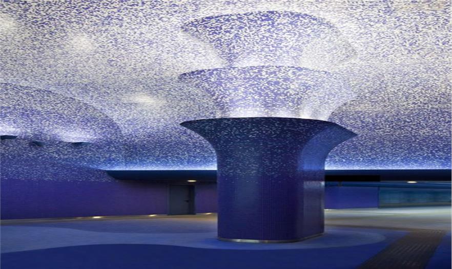 在意大利那不勒斯市地鐵藝術(shù)環(huán)線項目組的邀請下,Oscar Tusquets Blanca最近為其市內(nèi)的Toledo地鐵站設(shè)計了一個全新面貌。地鐵站內(nèi)部的墻面和地面全新覆蓋了一層深淺不一的藍(lán)色馬賽克。抬頭是一片夢幻般藍(lán)色星空,又讓人想起《少年派》中的奇妙海面。壯觀,璀璨讓人驚嘆不已。