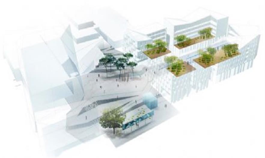 中央廣場(chǎng)南側(cè)的兩棟大樓包含酒店和混合使用功能的住宅及商業(yè)區(qū)域,其中最為顯著的特征是一棟13層的新建筑,其中容納了圖書(shū)館和辦公空間,營(yíng)造了城市的新地標(biāo)。各組成部分都能適應(yīng)各種用途,因此能夠根據(jù)客戶或社區(qū)需要進(jìn)行更改。項(xiàng)目一期工程預(yù)計(jì)將于2014年11月完工。
