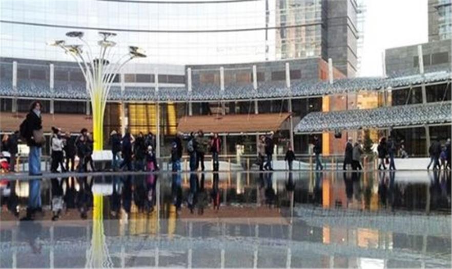 圍繞著一座60米寬的噴泉水池,廣場上設(shè)置了一圈用藤架遮擋的座椅。傾斜而下的兩層樓高的噴泉掩蓋了周圍道路的噪聲,也讓自然光照和通風(fēng)穿越了零售店和停車場。