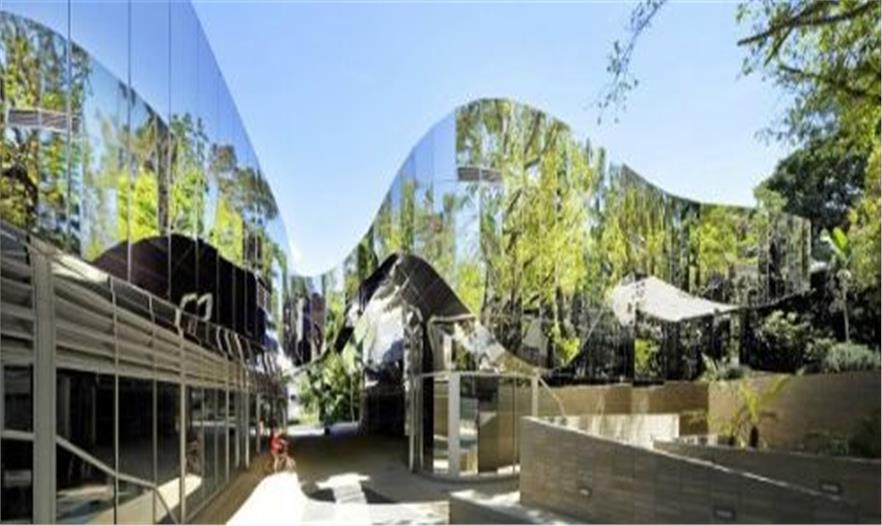 為了滿足市政府的要求,CWA提出了一種鏡子立面的設(shè)計方案,能如實反射出周圍的花園景致。建筑師將之描述為“與1987年的電影《鐵血戰(zhàn)士(Predator)》中外星怪物穿的隱形外套擁有相似的視覺效果”。隱藏的入口內(nèi)包含咖啡館露臺、信息和展覽空間,以及政府員工辦公室。這里使人行長廊更富有活力,并連接藝術(shù)中心與花園,同時還能全年為游覽悶熱潮濕的熱帶花園的游客提供一處陰涼干爽的區(qū)域。