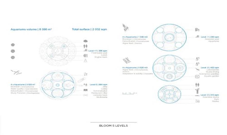 Bloom由來自巴黎的Sitbon建筑所設(shè)計(jì),進(jìn)入了國際建筑比賽Architize A+獎(jiǎng)“建筑和氣候”組的五強(qiáng)。漂浮的半球體結(jié)構(gòu)被認(rèn)為是解決全球變暖和海平面上升的途徑之一。巨大的浮游植物魚池將由一群科學(xué)家和海洋專家組成的長久員工監(jiān)測,魚池用來調(diào)控受全球變暖影響最為嚴(yán)重地區(qū)的氧氣含量。