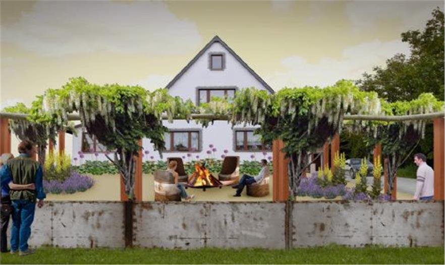 Cornelia Grimm[學生名]:重金屬花園:“一位金屬愛好者可以在這布置他的花園。帶著銹跡斑斑凹痕的老鐵門構筑成了柵欄,由耐候性鋼架搭成的蔓藤拱廊,在上面紫藤蘿攀緣而生。一個由大塊正方形鐵皮制成的火盆構成了花園的中心?!?