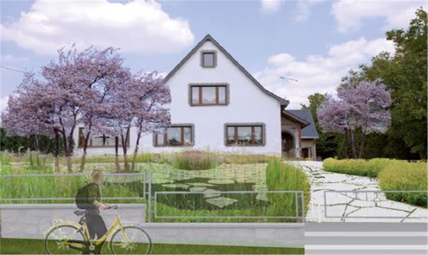 Elisabeth Egerter: 多樣性的統(tǒng)一:“一個由敞亮多邊形的混凝土片組成的統(tǒng)一地板磚鋪過花園,構筑成了連通性的元素。由不同高度的草地及草原植被產(chǎn)生了兩塊地段:即通往房屋之路和真正的花園。它產(chǎn)生了一種一步一步的自有的層次感。水池使花園變得有生氣,并且通過反射光使他融入進不同的氛圍中去。”
