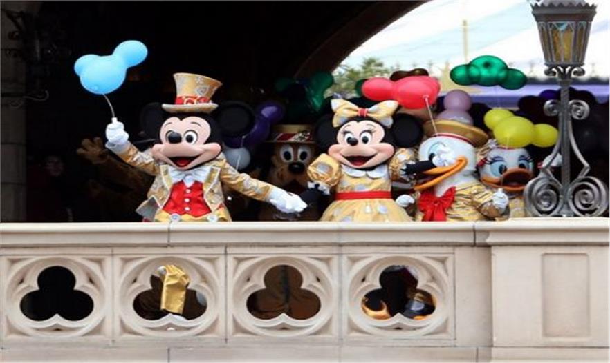米老鼠等人氣卡通人物聚集在灰姑娘城堡前的廣場上獻(xiàn)禮,運(yùn)營方東方樂園公司董事長加賀見俊夫等人致辭。