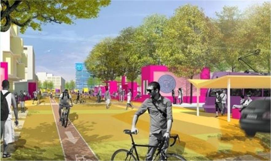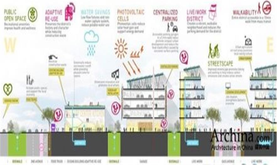環(huán)境、經(jīng)濟(jì)和文化可持續(xù)性是規(guī)劃的基本要素。公共開放空間的改善形成了利于步行的區(qū)域,減少了對停車位的需求,也提高了新的輕軌系統(tǒng)的可達(dá)性。規(guī)劃中還有一條自行車網(wǎng)絡(luò),景觀部分則以生物洼地來滲透和降低地表徑流,街景也因此得以改善。