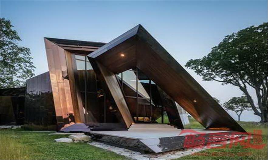 設(shè)計師運用多面結(jié)構(gòu),使場地不同角度均擁有多變流動的景觀。住宅面積達2000平方英尺,設(shè)計師將其構(gòu)想成由18個面、36個點、54條線構(gòu)成的回環(huán)形結(jié)構(gòu)。建筑表皮由鏡面型銅質(zhì)板材組成,與周邊景致色彩和諧一致,同時顯眼卓著。住宅室內(nèi)區(qū)域采用深色木板材裝飾,增添了溫暖優(yōu)雅的氛圍。